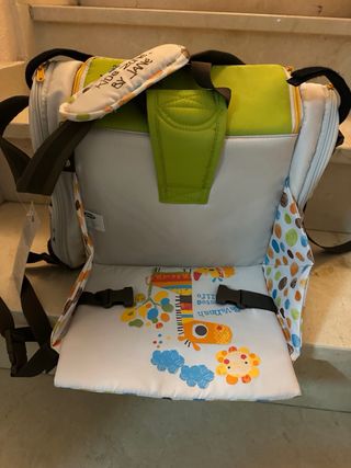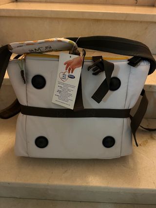 Mochila y asiento para bebé de la marca Jane, completamente nuevo. - Color blanco y detalles en amarillo. - Incluye etiqueta de seguridad. - Correa ajustable para el hombro.