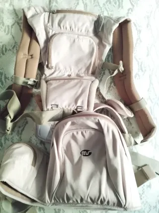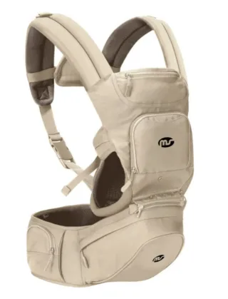 Mochila portabebés ergonómica de la marca MS, ideal para llevar al bebé de forma cómoda y segura. Su diseño permite distribuir el peso de manera equilibrada. - Color beige. - Diseño ergonómico. - Múltiples bolsillos de almacenamiento.