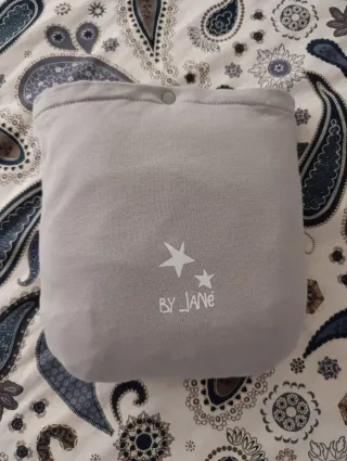 Fular de porteo de la marca Jane en color beige. Presenta un diseño con estrellas y el texto BY JANE bordado. Para llevar a tu bebé desde el nacimiento. Nuevo, cero uso por tener otra mochila de porteo. Se puede llevar al bebé hasta en tres posiciones. - Color: beige - Diseño: Estrellas y texto BY JANE - Bolsa cierre con botón a presión