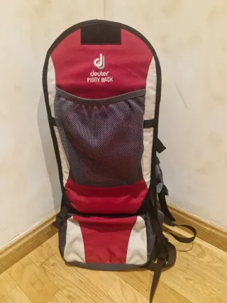 Mochila porta bebé Deuter Piggy Back en color rojo, blanco y gris. Se encuentra prácticamente nueva. - Diseño ergonómico. - Compartimento de malla frontal. - Correas ajustables.