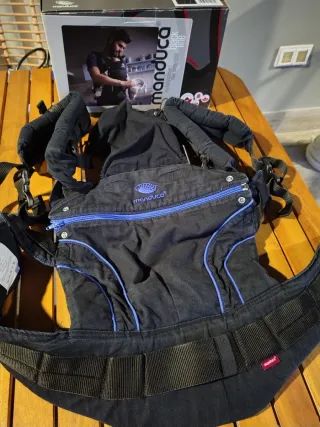Mochila portabebés Manduca en color negro y gris. Bastante usada y lavada, pero en buenas condiciones. Es fantástica de usar