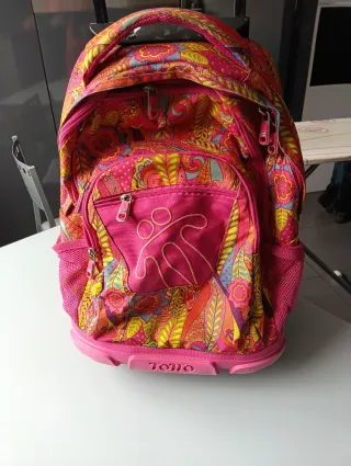 Mochila Totto con un divertido estampado. - Diseño con ruedas y asa extensible. - Compartimentos múltiples para organización. - Bolsillos laterales de malla.
