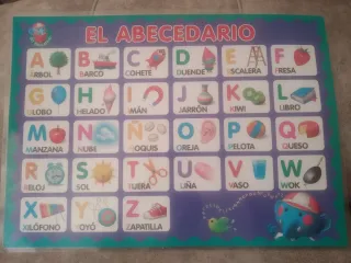 Lámina plastificada con abecedario español por un lado y juego de veo-veo por otro, 43x31 cm,1€ Mochila pequeña Donuts, forma redonda 22 cm diámetro 1€