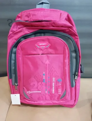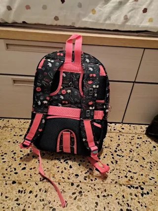 Mochila escolar de color rosa con detalles en gris y un diseño moderno. - Compartimento principal espacioso. - Bolsillo frontal con cremallera. - Tirantes ajustables y acolchados. - Asa superior para colgar. - Tamaño aproximado 40cm de altura por 30cm de ancho