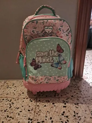 Mochila escolar con un encantador diseño de flores y mariposas, ideal para llevar todo lo necesario. Medidas 45 de largo y 34 de ancho - Base con ruedas para facilitar el transporte. - Compartimento principal espacioso. - Bolsillos laterales de malla. - Diseño frontal con mariposas y el mensaje Save the Planet.