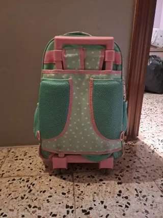 Carro Safta de color rosa para mochila escolar. Ideal para facilitar el transporte de libros y material. - Estructura de metal y plástico resistente. - Mango extensible. - Ruedas para facilitar el movimiento.