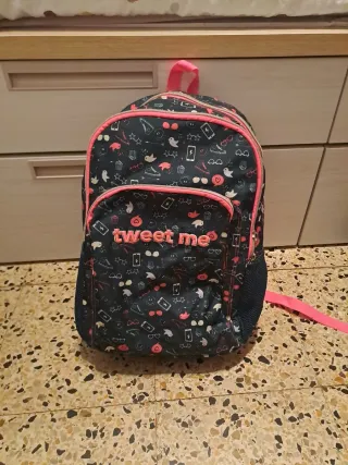 Mochila con un divertido estampado de tweet me y varios iconos. Medidas 46 de largo y 30 de ancho - Diseño con fondo oscuro y detalles en rosa. - Compartimento principal y bolsillo frontal. - Tirantes ajustables.