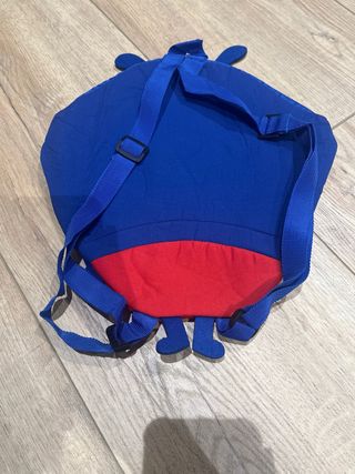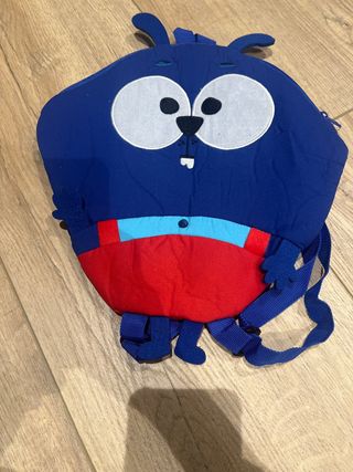 Mochila infantil con un divertido diseño de personaje. - Color azul principal. - Detalles en rojo y azul claro. - Orejas y brazos aplicados. - Cierre de cremallera - Mida bastante pequeña - si quereis lo bajo de precio ( pero escribirme pliss)