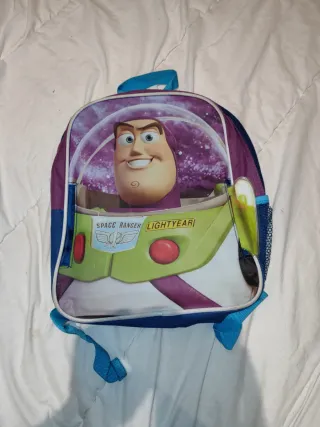 Mochila infantil con diseño de Buzz Lightyear de Toy Story. Ideal para los más pequeños. Le falta una ala. - Personaje Buzz Lightyear. - Diseño de traje de astronauta. - Colores morado, verde y azul. Precio negociable si te llevas varias cosas del perfil