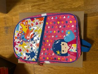 Mochila infantil con un divertido diseño de la marca Bubblegum. Sin estrenar. - Color naranja vibrante. - Cierre de cordón y velcro. - Adornos de personajes. Medidas: alto 30cm, ancho 27cm.