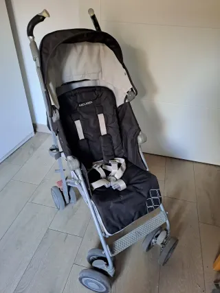 Cochecito de bebé Maclaren en color negro y gris. Es ligero y fácil de plegar. - Capota ajustable. - Arnés de seguridad de 5 puntos. - Reposapiés. - Ruedas delanteras giratorias.