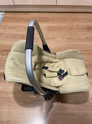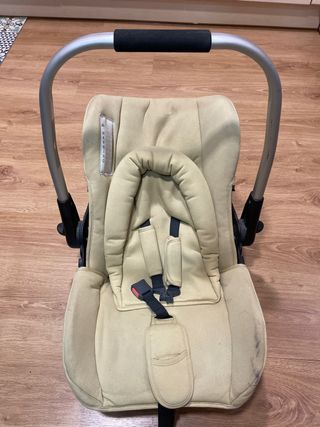 Silla de coche Maxi-Cosi en color beige, con asa de transporte. - Asa de transporte plateada con agarre negro. - Cinturón de seguridad de 5 puntos. - Reductor para recién nacidos.