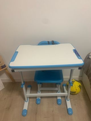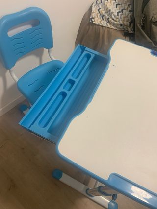 Conjunto de escritorio y silla infantil, ideal para que los más pequeños realicen sus tareas o actividades. - Escritorio con superficie blanca y detalles en azul. - Silla a juego, también en azul. - Estructura metálica con patas ajustables.