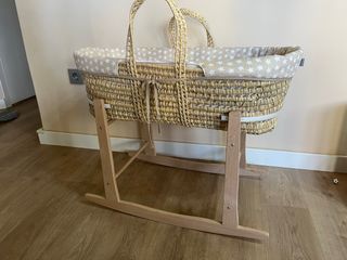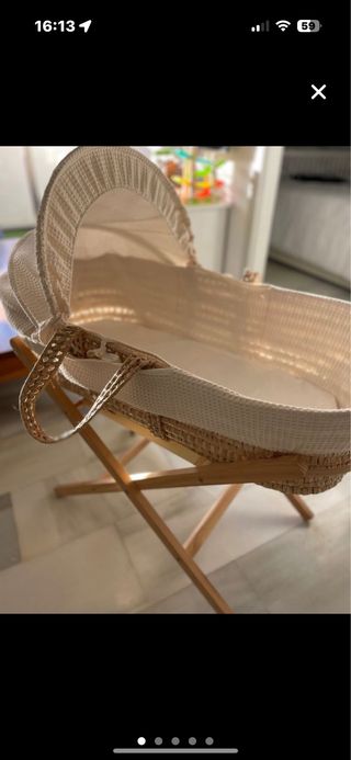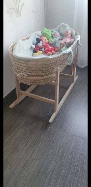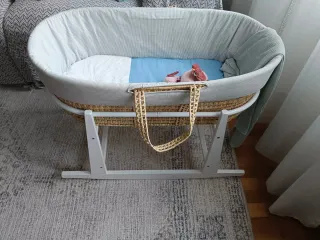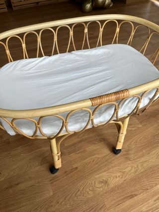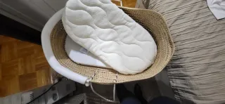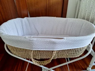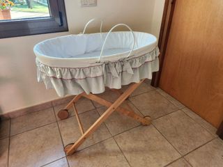Moisés de mimbre con soporte de madera. - Cesta de mimbre tejida. - Soporte de madera resistente. - Incluye colchón de calidad (comprado aparte, no el que viene con el moises que es de mala calidad) y fundas. Se regala tambien bajeras y protector colchon Usado solo 3 meses, estas en perfecto estado