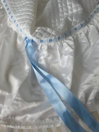 Conjunto de ropa para moisés de mimbre de bebé. Incluye un acolchado blanco con detalles de puntilla y cintas de raso azul. También le puedes cambiar el color del lazo - Tejido blanco acolchado. - Ribete de puntilla con detalles azules. - Lazos de raso azul.