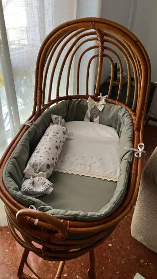 Preciosa cuna de mimbre para bebé, sin uso. Uso cuna de colecho finalmente.Ideal para crear un ambiente cálido y acogedor en la habitación infantil. - Estructura de mimbre resistente y de alta calidad. - Diseño elegante y atemporal. - Incluye colchón y textiles