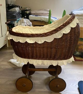 Cuna moisés con estructura de mimbre y base de madera. - Cesta de mimbre tejida. - Base de madera con ruedas. - Forro interior de tela.