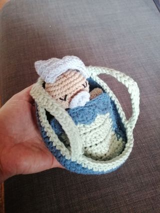 Bebé durmiendo en un moisés con almohada y mantita. Todo hecho a mano de crochet con hilo de algodón. Mide 15 cm de largo.