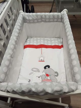 Preciosa cuna moisés para bebé, ideal para los primeros meses. Está en muy buen estado y es perfecta para crear un ambiente acogedor y seguro para el recién nacido. Usado durante 7 meses - Cesta de mimbre con estructura de madera blanca. - Tejido blanco de algodón. - Incluye colchón y juego de sábanas a juego. Valorado en 300€