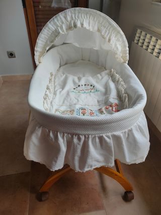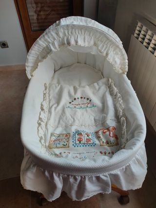 Se vende moisés de mimbre + patas de madera con juego de sábanas.