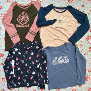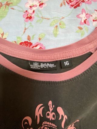 Lote de cuatro camisetas de manga larga para niña: una de Harry Potter (Wizarding World), una de Mickey Moisés (Disney Mickey and Friends), una estampada con flores (C&A) y otra, con la frase ‘Choose happiness’ (TEX). Las dos de licencias tienen la talla 16 pero tallan algo menos -mi hija las ha usado con 12-13-, al igual que la TEX, aunque sea de la talla S de mujer. La de flores, que solo se usó una vez, es de talla 158-164 cm. La de Mickey tiene bolitas porque la tela debe de llevar poliéster. Las otras tres son 100% algodón. Si compras el lote, 3,95€ y, de REGALO, la camiseta negra que se ve en la última foto. Por separado, 1,10€ cada una. SOLO ENVÍOS.