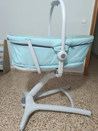 Moisés 4 en 1 de la marca Chicco. Color verde agua. Tiene marcas de desgaste por el roce y el uso pero la estructura está perfecta. Es súper útil para los peques. Se convierta también en silla y puedes subirlo y bajarlo a varias posiciones.