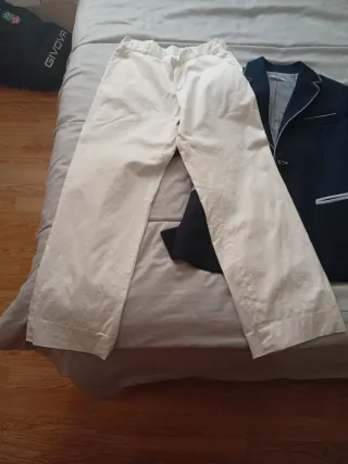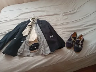 Conjunto completo para comunión de niño. - Chaqueta azul marino. - Camisa blanca con rayas azules. - Corbata blanca con rayas azules. - Pantalón a blanco, necesita remiendos, está en las fotos. - Cinturón azul marino. Todo nuevo, usado dos veces. Pero el pantalón tiene 1 descosido y los bajos para arreglar un poco, por eso el precio tan bajo. Zapatos talla 36.
