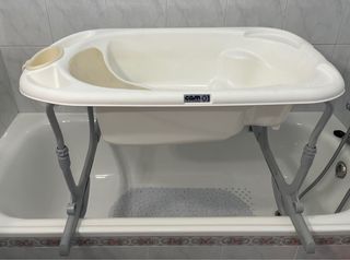 Bañera para bebé con soportes ajustables, diseñada para colocar sobre la bañera de adultos. - Color blanco y beige. - Soportes de metal gris. - Marca: Cam.