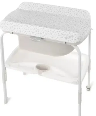 Bañera cambiador para bebé de la marca Jané. Incluye una cubeta para el baño y un cambiador acolchado con estampado de estrellas. - Estructura metálica blanca. - Cubeta de baño integrada. - Cambiador con funda de estrellas grises. - Bandeja inferior para accesorios.