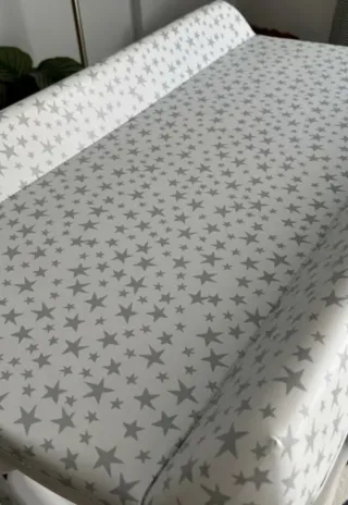 Protector de cuna acolchado con un diseño de estrellas blancas sobre fondo gris.cubre toda la cuna - Tejido suave y resistente. - Estrellas blancas estampadas. - Color gris.