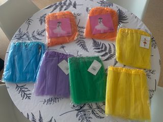Conjunto de siete faldas tutú para niñas en vibrantes colores. - Incluye faldas en naranja, rosa, amarillo, azul claro, morado y verde. - Talla única, ideales para diversas ocasiones. - Cada falda viene empaquetada individualmente. - Precio por el lote completo.