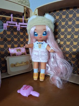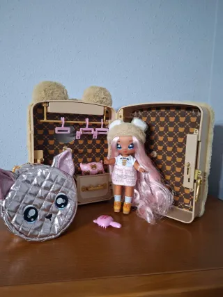 Set de juego Na Na Na Surprise que incluye una maleta con diseño de osito, una muñeca y varios accesorios. Como nueva.tiene los accesorios que se venden en la foto. Medidas: Muñeca: 22 cm Maleta: 19 x 27 x 10 cm - Maleta con interior estampado y perchas. - Muñeca con gorro, ropa y zapatos. - Incluye un bolso plateado con forma de gato. - Peine rosa con forma de corazón.
