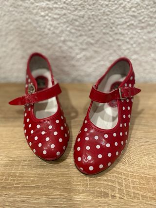 Zapatos de flamenca para niña en talla 27. Diseño clásico con lunares. - Color rojo con lunares blancos. - Cierre de hebilla. - Suela antideslizante.