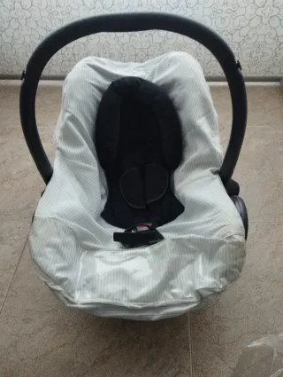 Silla de coche Maxi-Cosi con funda. - Funda a rayas blancas y grises. - Asa de transporte negra.