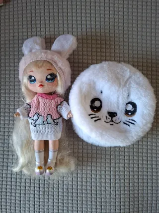 Adorable muñeca Na Na Na Surprise con su bolsito. Mide 22 cm. - Muñeca con detalles pintados a mano. - Gorro de conejo de peluche. - Vestido de punto rosa y blanco con diseño de pájaros. - Incluye accesorio bolso redondo de peluche blanco con cara de foca.