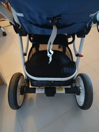 Carro de bebé en color azul y gris, con detalles acolchados. - Marca:Breva(alemana) - Capota amplia. - Asiento reclinable. - Cesta de almacenaje inferior. - Ruedas delanteras giratorias. - Ruedas traseras se quitsn para plegar y asi es mas facil a la hora del coche. - Lleva pada cuando llueve, el protector.