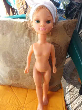 Muñeca Nancy de plástico con pelo rubio y ojos verdes. - Incluye toalla blanca en la cabeza. - Cuerpo de plástico. - Piernas y brazos articulados. - 45 cm