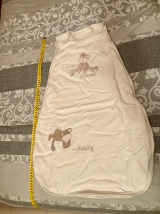 Saco de dormir para bebé, de 0-6 meses. - Color crema. - Estampado de osito. - Textura muy agradable de piel melocotón. - con botones por la zona de los hombros y cremallera que se abre desde los pies hasta un lateral entero. - SIN ESTRENAR, y siempre guardado en su funda.