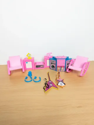 Centro de entretenimiento para muñecas Barbie de 1987. Incluye varios accesorios. - Dos sillas mecedoras rosas. - Un centro de música rosa y azul con altavoces. - Un teléfono rosa. - Un reloj amarillo. - Una guitarra eléctrica morada. - Una guitarra eléctrica rosa. - Auriculares azules. - Una figura de muñeca.