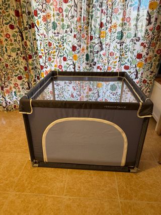 Parque infantil de la marca Perseverance, ideal para que los más pequeños jueguen de forma segura. Incluye una colchoneta marca PEKITAS. - Estructura de tela gris. - Paneles de malla para ventilación. - Diseño plegable para fácil almacenamiento.