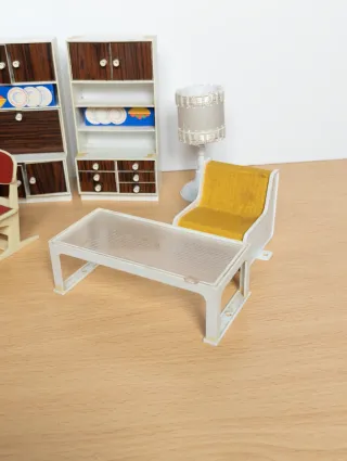Para arreglar. Conjunto de muebles vintage para casa de muñecas, de los años 60 y 70. Incluye varios elementos para amueblar diferentes estancias. - Tres armarios/librerías con puertas y estantes. - Dos sillas rojas con estructura blanca. - Una mesa auxiliar de madera. - Una mesa de centro transparente. - Un sofá amarillo con base blanca. - Una lámpara de pie blanca. - Una lámpara de mesa con pantalla.