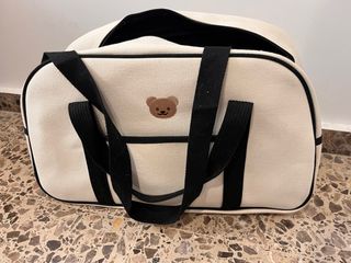 Bolso de tela color crema con un adorable osito bordado en la parte frontal. Ideal para llevar lo necesario para el bebé o para preparar la maleta del hospital. - Diseño con osito. - Asas negras. - Ribete negro.