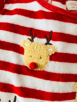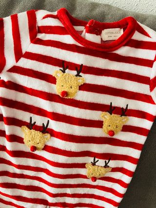 Este mono de bebé es perfecto para las fechas navideñas. Presenta un diseño a rayas rojas y blancas y está decorado con simpáticos renos (se ha utilizado solamente una vez). - Talla: 3-6 meses (68 cm). - Diseño a rayas rojas y blancas. - Adornos de renos con nariz roja en cuerpo y pies.