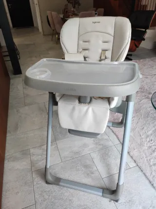 Trona de la marca Inglesina en color beige. Es un asiento cómodo y seguro para los más pequeños. Reclinable totalmente, acabado tipo piel para una limpieza fácil. - Bandeja extraíble. - Reposapiés. - Arnés de seguridad.