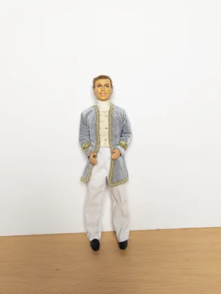 Muñeco Ken vestido de príncipe. - Traje morado con detalles brillantes. - Pantalones cortos azules. - Zapatos negros.