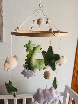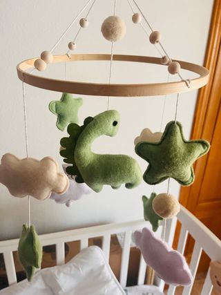 Precioso móvil de cuna colgante con temática de dinosaurios y elementos decorativos y soporte de madera ajustable a la cuna, ideal para activar los sentidos del bebé. - Figura de tela de dinosaurios, nubes y estrellas decorativas. - Cascabeles en las nubes para estimular a tu bebe. - Soporte de sujeción de madera para cunas.