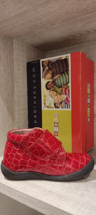 Botines rojos de charol para niña de la marca PABLOSKY. Tienen un diseño con escamas y cierre de velcro. - Talla 25. - Color: Rojo - Material: Charol - Cierre: Velcro - Marca: PABLOSKY