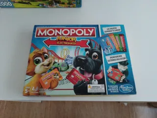 Juego de mesa Monopoly Junior Electrónico de Hasbro. Ideal para los más pequeños de la casa. Está en muy buen estado incluida la caja - Incluye tablero y piezas - Tarjetas bancarias electrónicas para guardar el dinero. - Incluye unidad bancaria electrónica fácil de usar