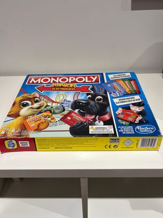 Juego de mesa Monopoly Junior Electrónico de Hasbro Gaming. Solo se ha usado una vez, está prácticamente nuevo. - Incluye unidad bancaria electrónica. - Tarjetas para guardar el dinero. - Apto para 2-4 jugadores.