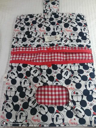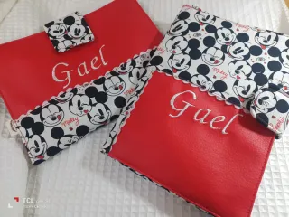 Práctico porta toallitas con un divertido diseño de Mickey Mouse. Personalizado con el nombre Gael. - Estampado de Mickey Mouse. - Borde con encaje. - Cierre de velcro.